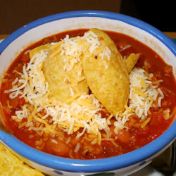 - To serve, ladle into bowls, and top with corn chips and shredded Cheddar cheese.